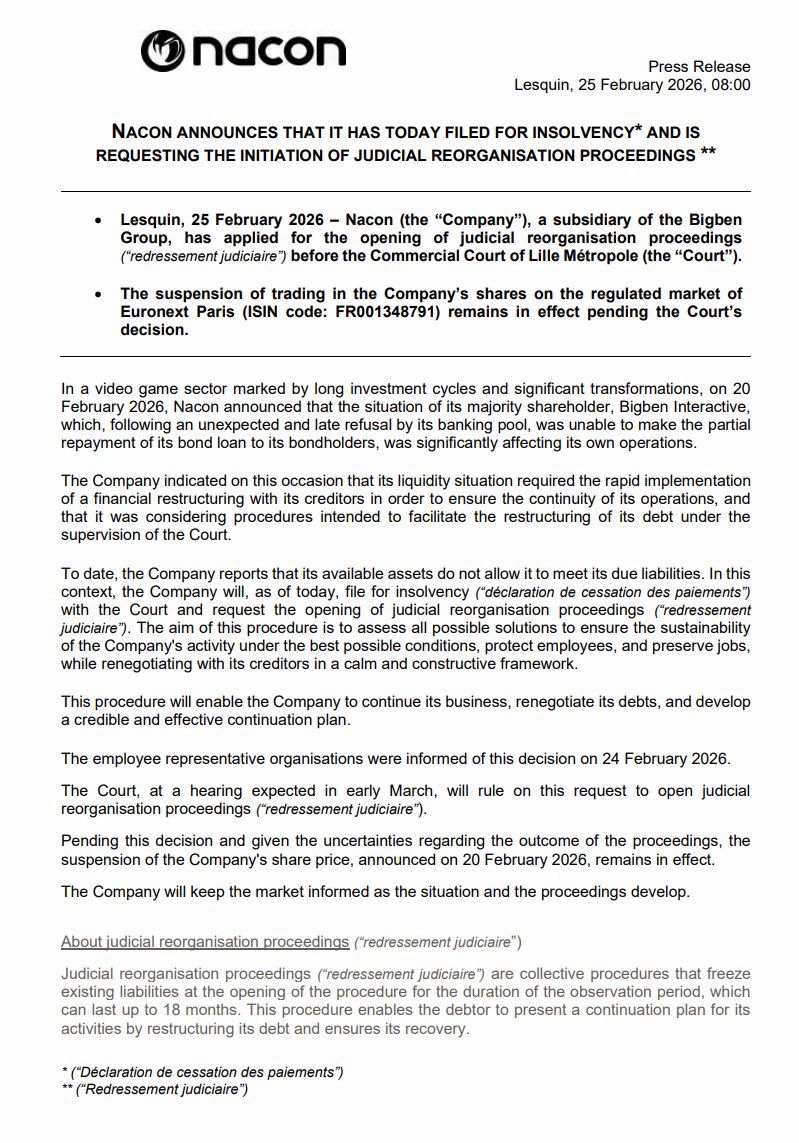Derrière ce report calendaire se cache une réalité structurelle critique pour l’entité française. Fin février 2026, Nacon a officiellement déclaré se trouver en cessation de paiements et a sollicité l’ouverture d’une procédure de redressement judiciaire auprès du tribunal de commerce de Lille. Face aux incertitudes entourant l’avenir de l’entreprise, la cotation en bourse des actions de Nacon a été suspendue le 20 février 2026 et demeure aujourd’hui gelée.