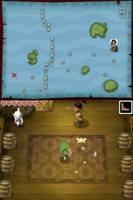 L’une des fonctionnalités les plus originales de Phantom Hourglass est la possibilité pour le joueur d’annoter librement la carte du monde affichée sur l’écran tactile. Repères personnels, notes sur les quêtes en cours, croquis des solutions d’énigmes : tout peut être écrit et dessiné directement à la main. Certaines énigmes du jeu exigent d’ailleurs explicitement que le joueur reproduise un symbole ou un schéma vu dans le monde sur la carte elle-même, faisant de l’annotation une mécanique de jeu à part entière.