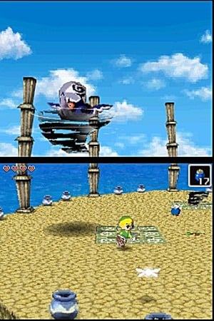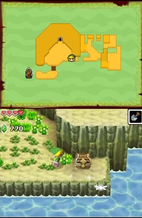 La présence de 2 écrans oblige à une réflexion sur la distribution de l’information visuelle. L’écran supérieur, fixe, affiche la carte de la zone en cours, les informations de statut (vie, sablier, rubis) et dans certains contextes une vue secondaire. L’écran inférieur tactile affiche l’espace de jeu principal, les ennemis, les décors et Link lui-même.