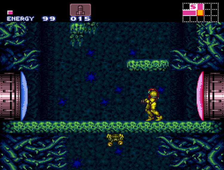 Le génie de Super Metroid réside dans son absence de texte. Le jeu vous apprend à jouer sans vous le dire. Au début du jeu, vous tombez dans un trou. Impossible de remonter. La seule issue est d’aller à droite. Mais plus tard, vous revenez au même endroit. Un petit animal vert (Etecoon) vous montre qu’on peut rebondir sur les murs et ainsi vous initier au Wall Jump.