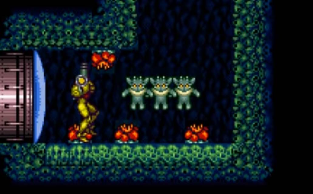 Le jeu s’ouvre sur un fond noir. Samus ne peut pas aller à droite (bloquée par un mur). Elle doit aller à gauche. Ce simple choix de design pose les bases : ici, on ne traverse pas le niveau, on s’y enfonce. C’est une descente aux enfers claustrophobe où le joueur n’est pas le bienvenu.