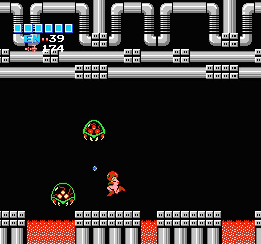 Le jeu affiche un compteur décroissant (« X Metroids restants ») en bas de l’écran. C’est une inversion totale du paradigme de l’époque : on ne joue pas pour sauver une princesse, on joue la reine pour nettoyer une espèce.