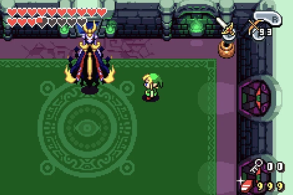 La console portable de Nintendo, lancée en 2001, approche de la fin de son cycle commercial avec l’annonce imminente de la Nintendo DS, la console qui lui succédera fin 2004. The Minish Cap tire le meilleur parti des capacités de la Game Boy Advance, exploitant sa résolution, ses capacités de rendu et ses possibilités d’animation avec une maîtrise technique qui représente un l’aboutissement de la machine.