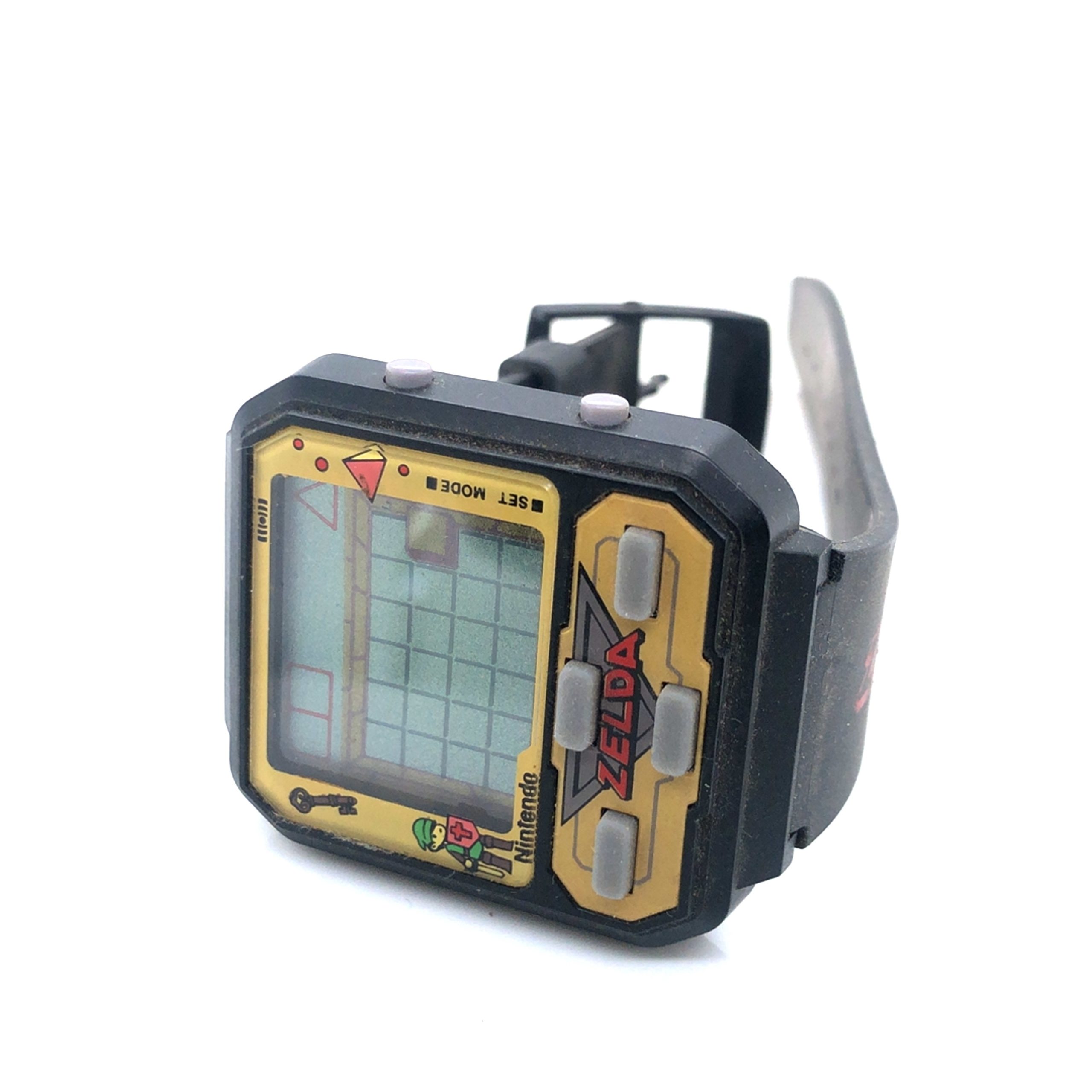 Plus rare, la montre-bracelet « Game & Watch » Zelda commercialisée par la marque Zeon (ou parfois Nelsonic) sous licence officielle Nintendo dans les années 90. Contrairement au Game & Watch classique de 1989, celle-ci est une montre LCD. Le gameplay est très simple : Link doit progresser dans des donjons représentés par des cases fixes sur l’écran à cristaux liquides, éviter les pièges et vaincre des ennemis pour récupérer des fragments de la Triforce.
