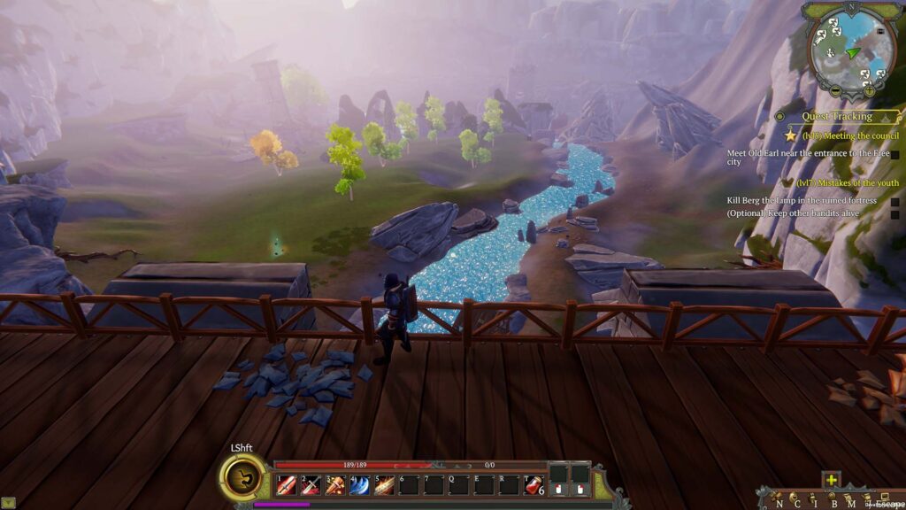 Le monde est découpé en zones de niveaux progressifs (1-10, 10-20, 20-30…) À la manière d’un MMORPG jouable hors ligne, Donjons, ruines submergées et forts abandonnés sont nombreux. Le voyage rapide est volontairement restreint en début de partie, ce qui pousse à parcourir le terrain à pied ou à cheval.
