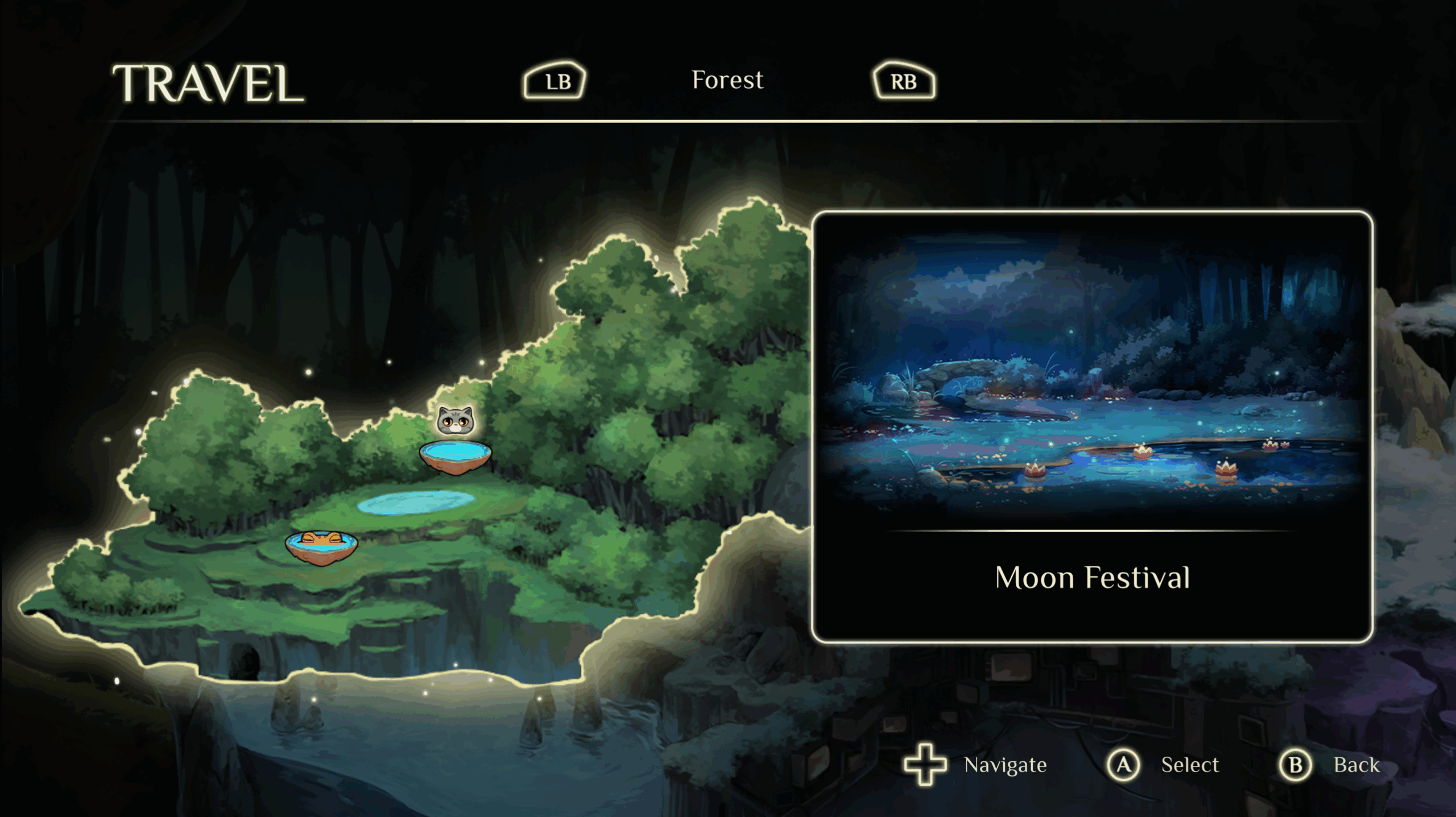 Le style visuel privilégie des contours traditionnels et une palette de couleurs lumineuse qui évoque naturellement l’univers Ghibli, ou encore, on aura une pensée pour le sublime Ori and the Blind Forest. On retrouve cette douceur caractéristique des films d’animation japonais, cette attention portée aux petits détails de la nature, la façon dont les feuilles frémissent, dont l’eau réfléchit la lumière, dont les créatures bougent avec fluidité. L’ensemble est parfait dans son exécution, avec une consistance graphique remarquable du début à la fin.