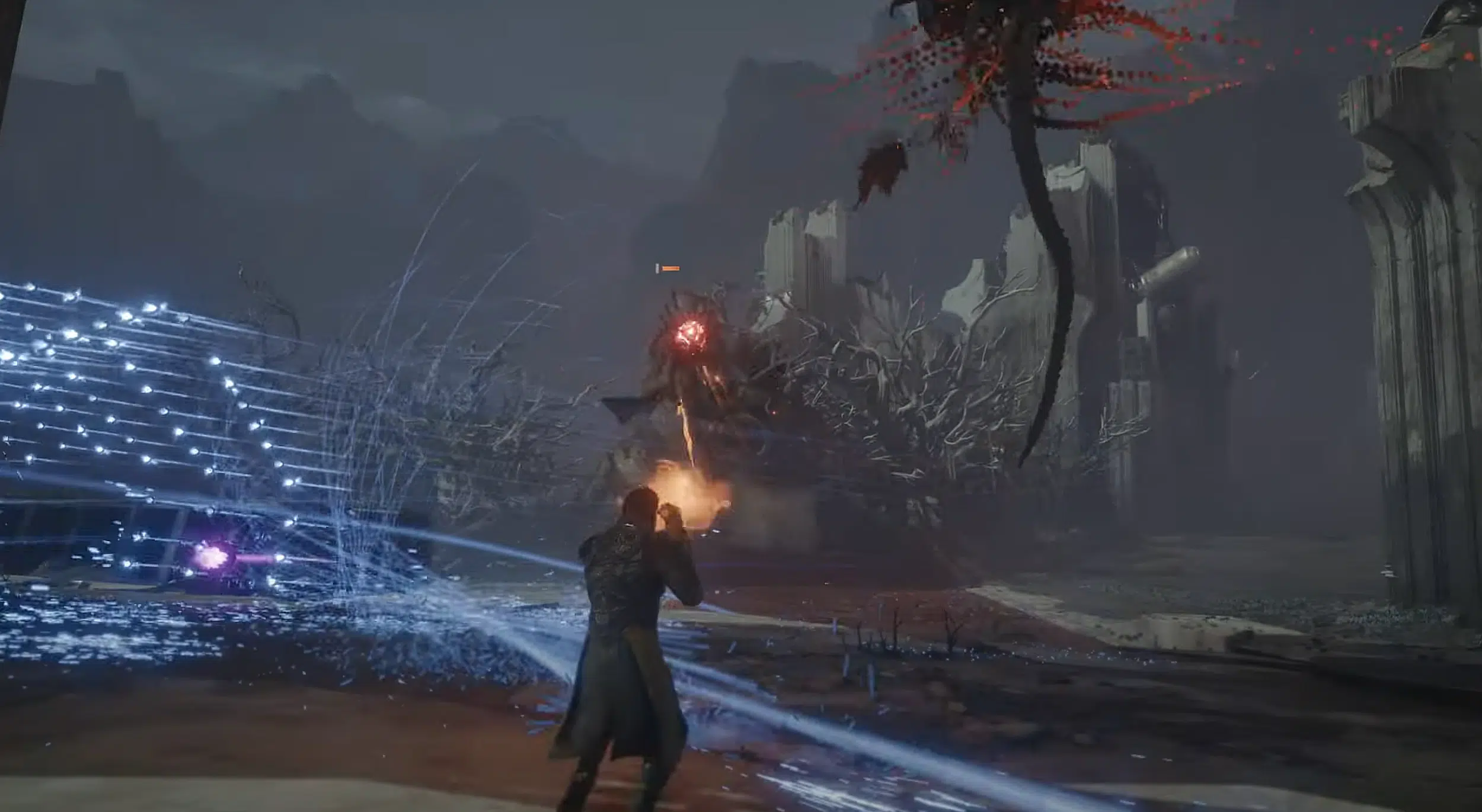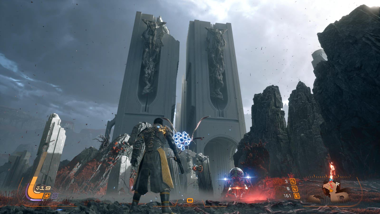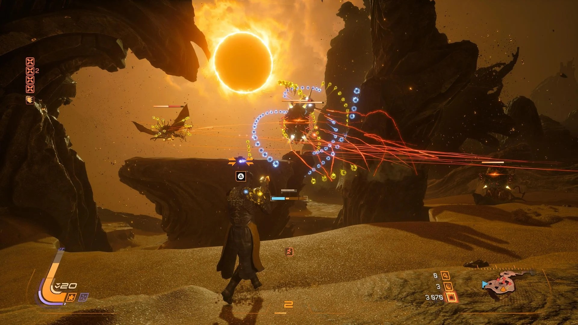 La mécanique centrale qui distingue Saros de son prédécesseur est le système de bouclier. Là où Returnal reposait principalement sur l’esquive, Saros introduit un champ protecteur capable d’absorber certains projectiles ennemis, les bleus, pour recharger sa jauge et déclencher une attaque spéciale. Les projectiles jaunes, eux, doivent obligatoirement être esquivés. On jongle donc constamment entre absorption et déplacement, ce qui modifie profondément le rythme des affrontements et encourage une posture plus agressive. La phase d’adaptation est réelle et peut déstabiliser les habitués des jeux d’action classiques, mais elle ouvre sur une profondeur de jeu solide une fois maîtrisée.