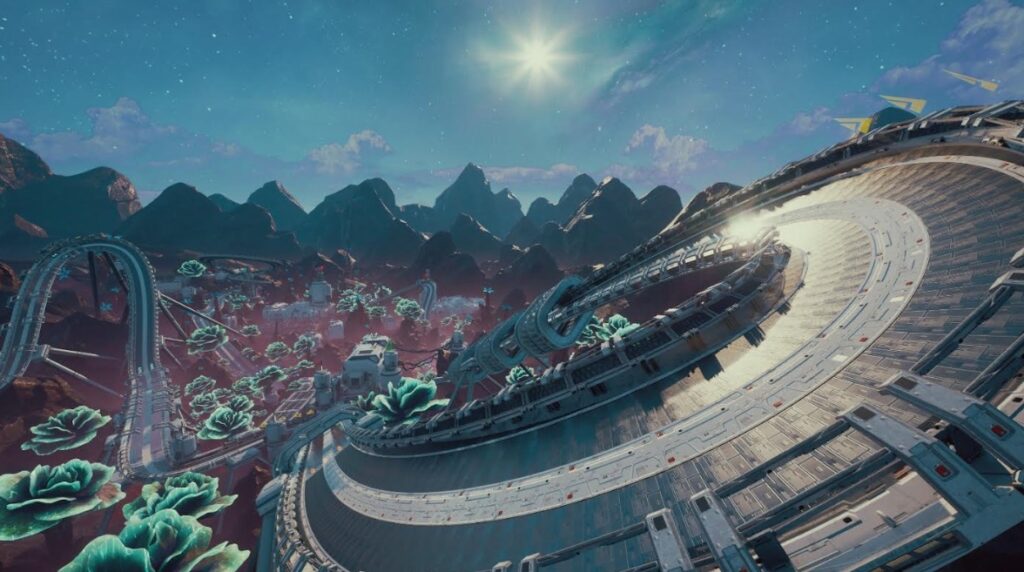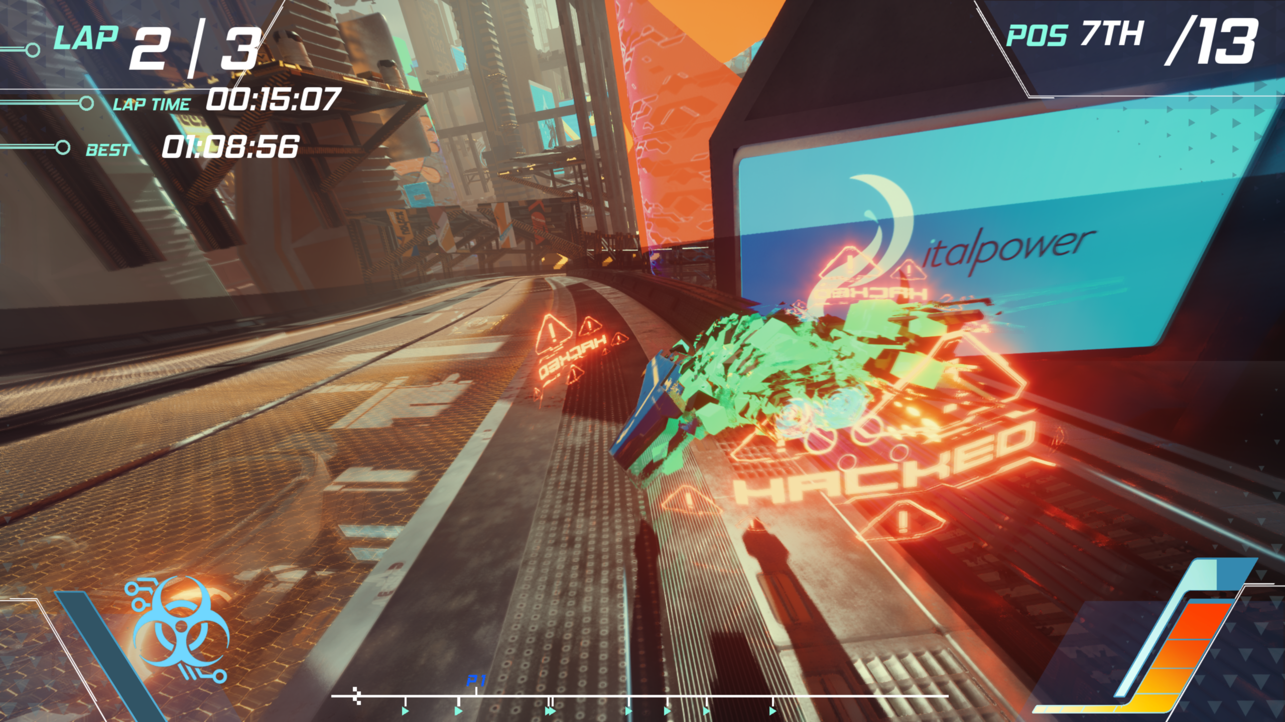 Le jeu souffle le chaud et le froid avec une direction artistique Rétro-Futuriste propre et lisible. L’animation est impeccable, le framerate ne bronche pas et reste au-dessus des 60 FPS, ce qui est capital pour la sensation de vitesse. Certains circuits ont un panorama attirant pour l’oeil.