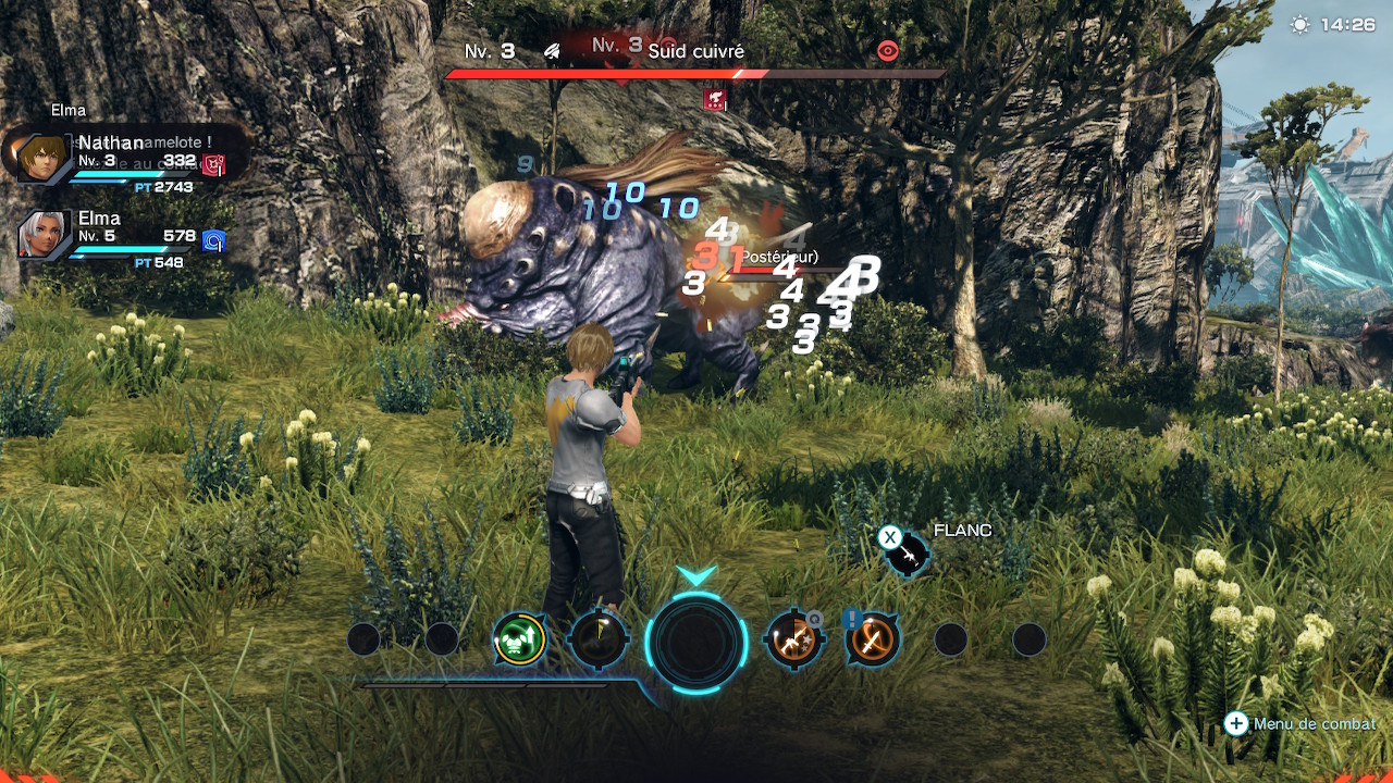 Le gameplay de Xenoblade Chronicles X est pour ma part le meilleur et le plus riche de toute la saga, il est tellement vaste que cela peut intimider. Les bases restent familières aux fans de la franchise des combats en temps réel où les arts (compétences) s’utilisent à la manière d’un MMO, avec des auto-attaques permanentes et une gestion de la position par rapport à l’ennemi.