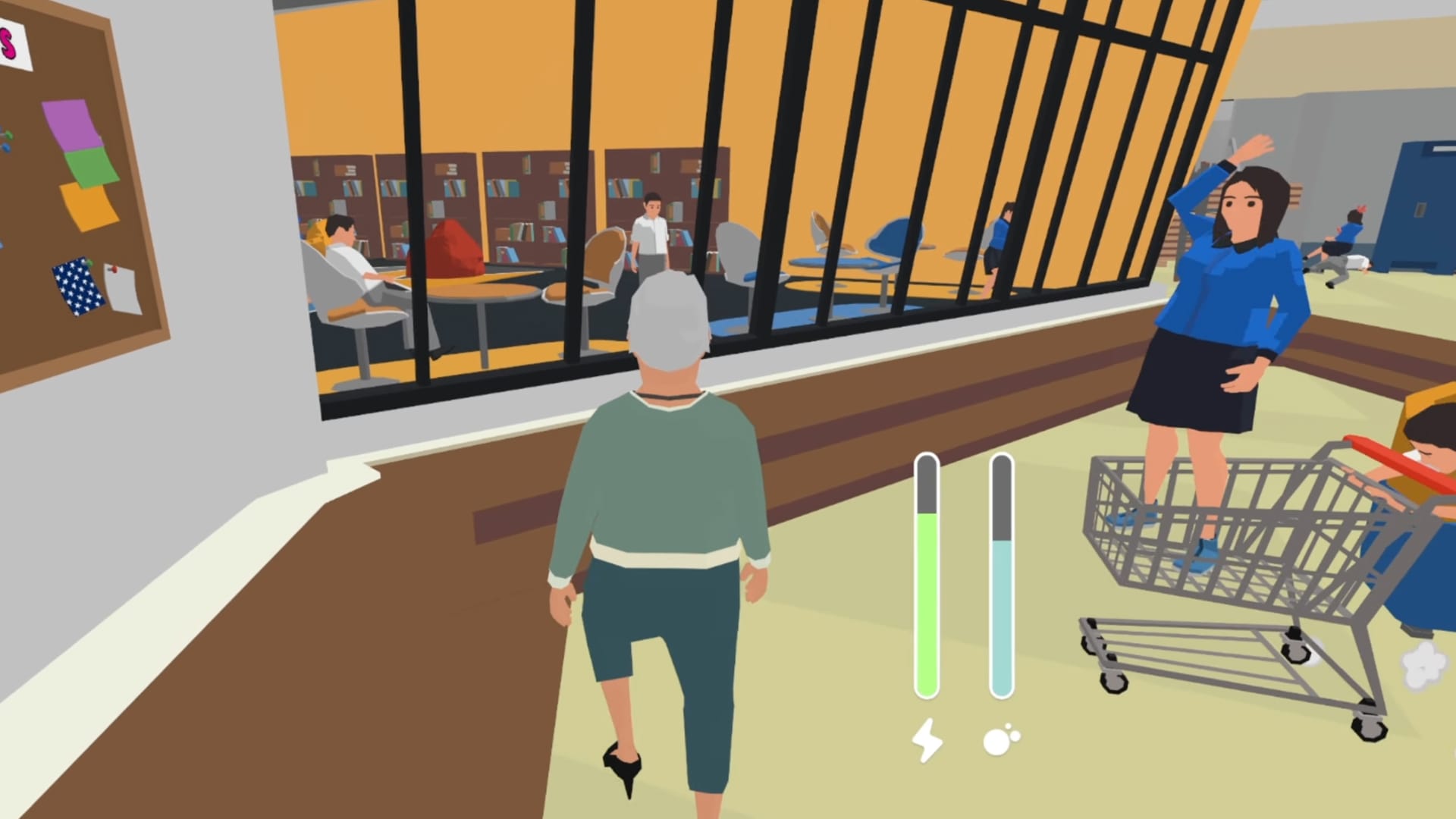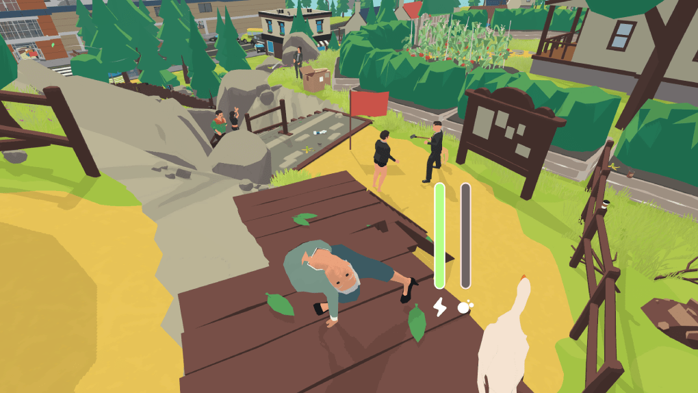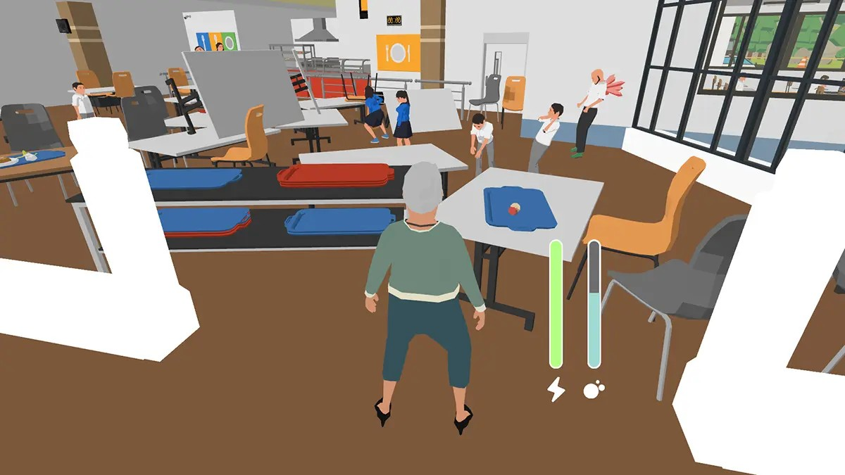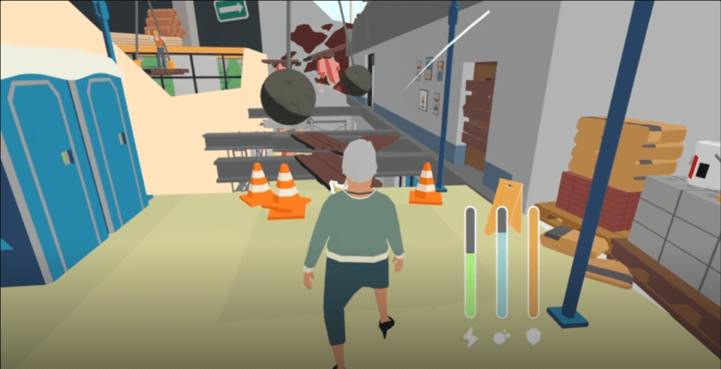 On contrôle chaque jambe de Mamie indépendamment avec les touches A et D, tout en gérant une jauge d’énergie et une jauge de souffle. Car oui, elle oublie de respirer et la touche W est dédiée à cette fonction vitale, car Mamie n’est plus toute jeune hein. S’ajoutent à cela la touche S pour cligner des yeux, et le clic gauche pour parer les projectiles comme les frisbees, bombes et autres joyeusetés lancés par des passants peu respectueux des aînés.