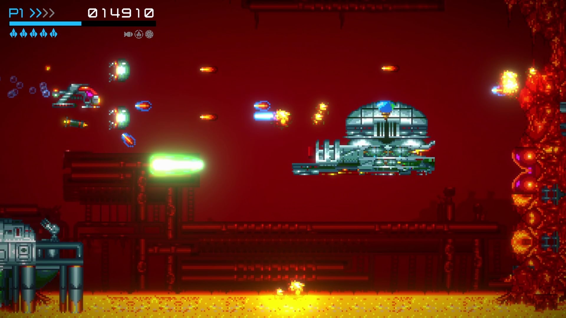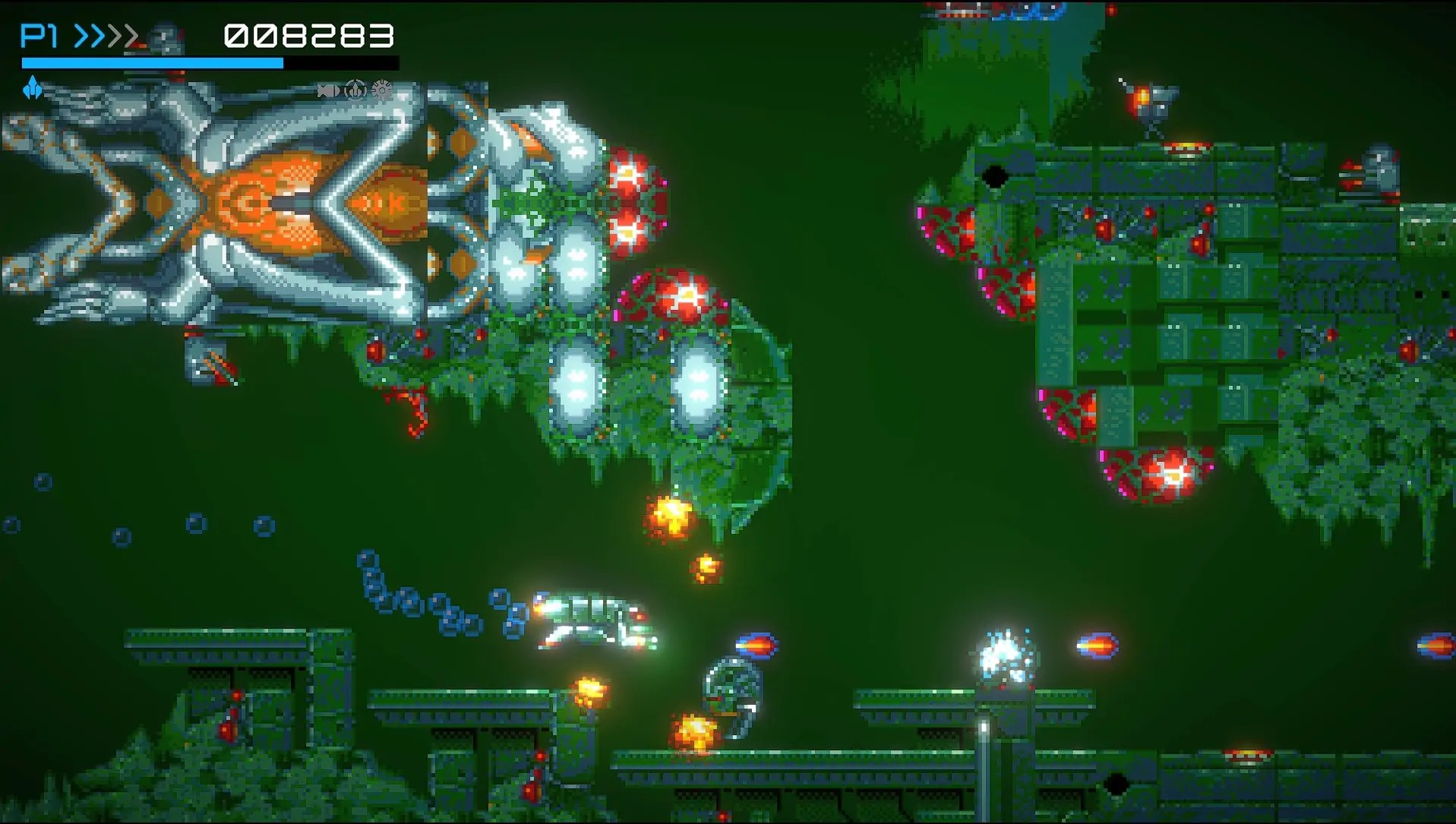 X-Out réussit le pari délicat de moderniser son esthétique tout en conservant son identité rétro. Les sprites pixelisés d’origine ont été entièrement recréés en haute résolution et enrichis d’effets de particules et d’éclairages modernes. Le résultat conserve le charme du pixel art de l’époque tout en bénéficiant d’un niveau de détail propre.