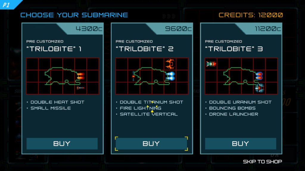 Ce système de boutique m’a souvent mis dans cette réflexion : dois-je économiser mes points pour maximiser mon score final ou investir immédiatement pour survivre plus longtemps ? Quatre types de sous-marins sont disponibles, chacun ayant ses propres caractéristiques en termes de résistance et de maniabilité et du nombre d’accessoires que nous pouvons équiper. Les options d’armement incluent des ondes soniques, des tirs puissants, des missiles à tête chercheuse, et divers satellites aux mouvements paramétrables.